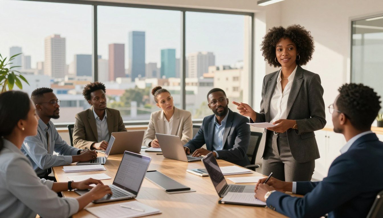 A dynamic business meeting scene set in a modern office environment in Senegal. In the foreground, a diverse group of professional individuals, dressed in smart business attire, are engaged in discussion around a table filled with documents, laptops, and financial charts. The middle ground showcases large windows revealing a view of Dakar’s skyline, with iconic buildings and palm trees swaying outside. In the background, a whiteboard filled with graphs and financing options highlights the theme of startup costs. Soft, natural lighting floods the room, creating an inviting and focused atmosphere. The overall mood is one of collaboration and ambition, capturing the essence of entrepreneurship in Senegal.
